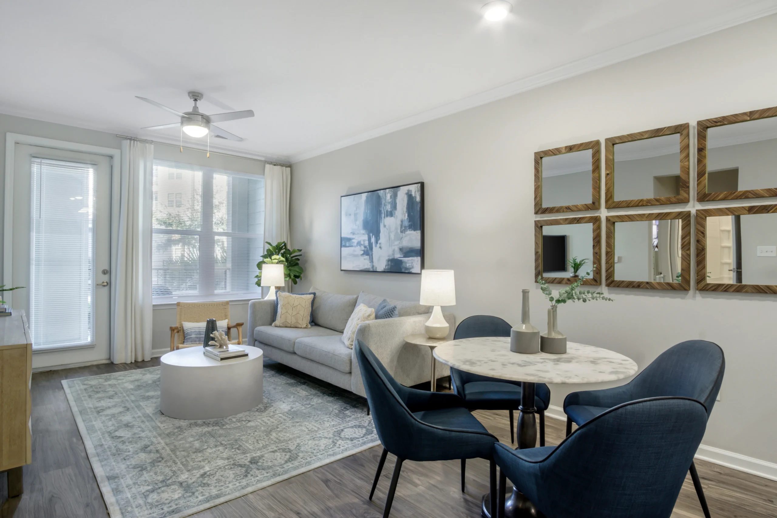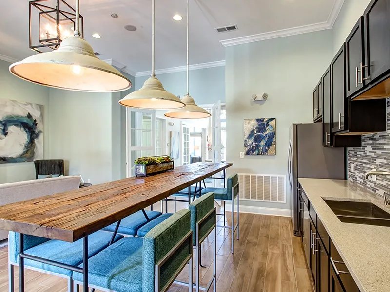 Apartments come in one, two, and three-bedroom layouts with open-concept designs, breakfast nooks, nine-foot ceilings, and oversized private patios or balconies. Each unit features chef-inspired kitchens with espresso cabinetry, wood plank-style flooring, modern fixtures, in-unit washers and dryers, ceiling fans, and walk-in closets.