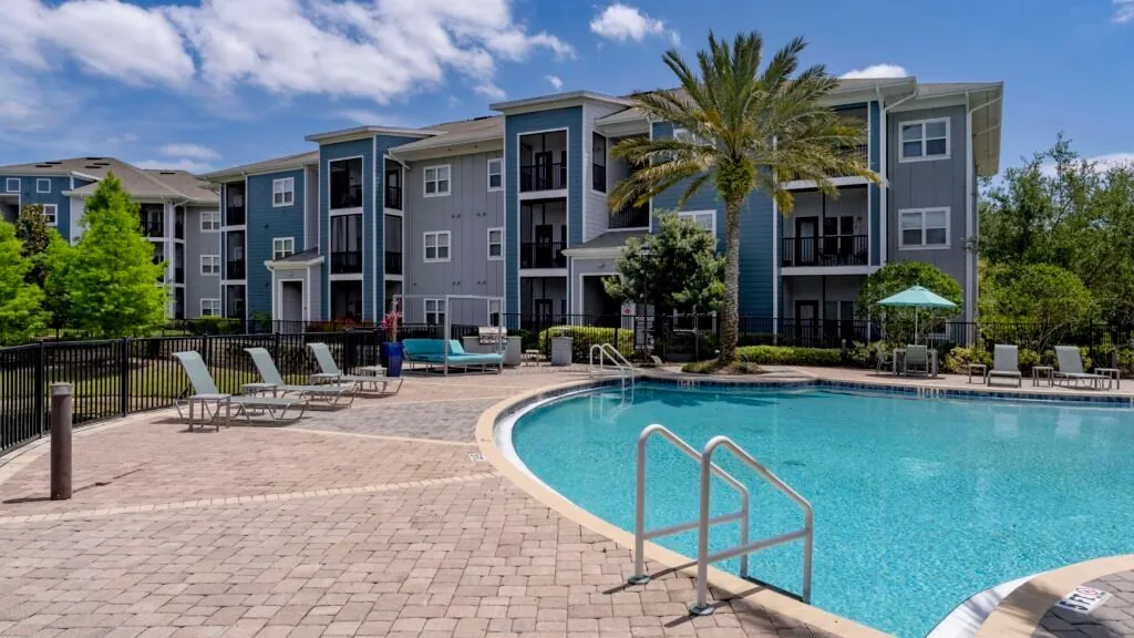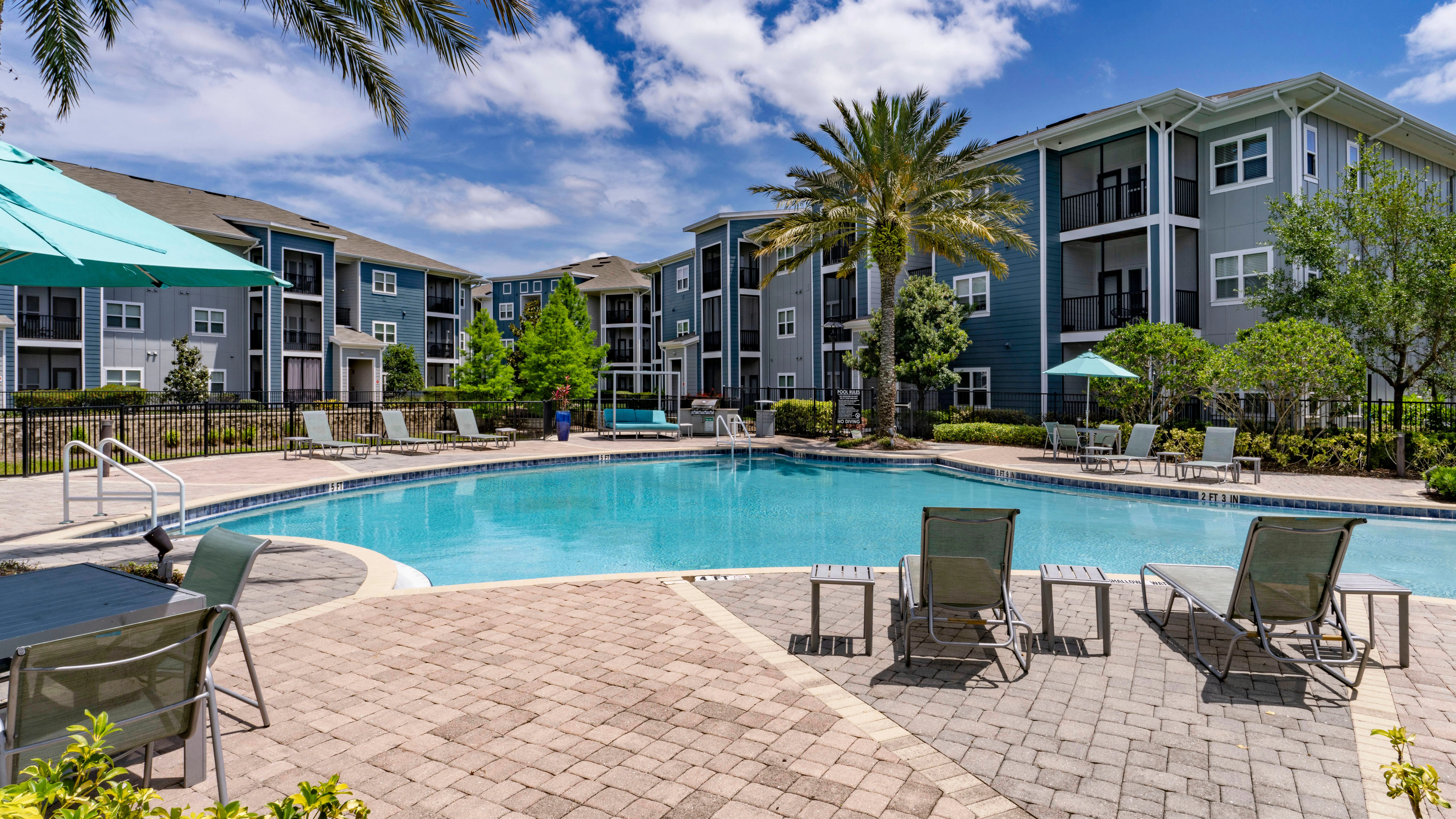 Each unit is equipped with vinyl wood plank flooring, quartz countertops with glass backsplash, and custom espresso cabinetry. Residents also enjoy stainless-steel appliances, kitchen islands, walk-in closets, in-unit washer and dryer, and screened-in lanais.