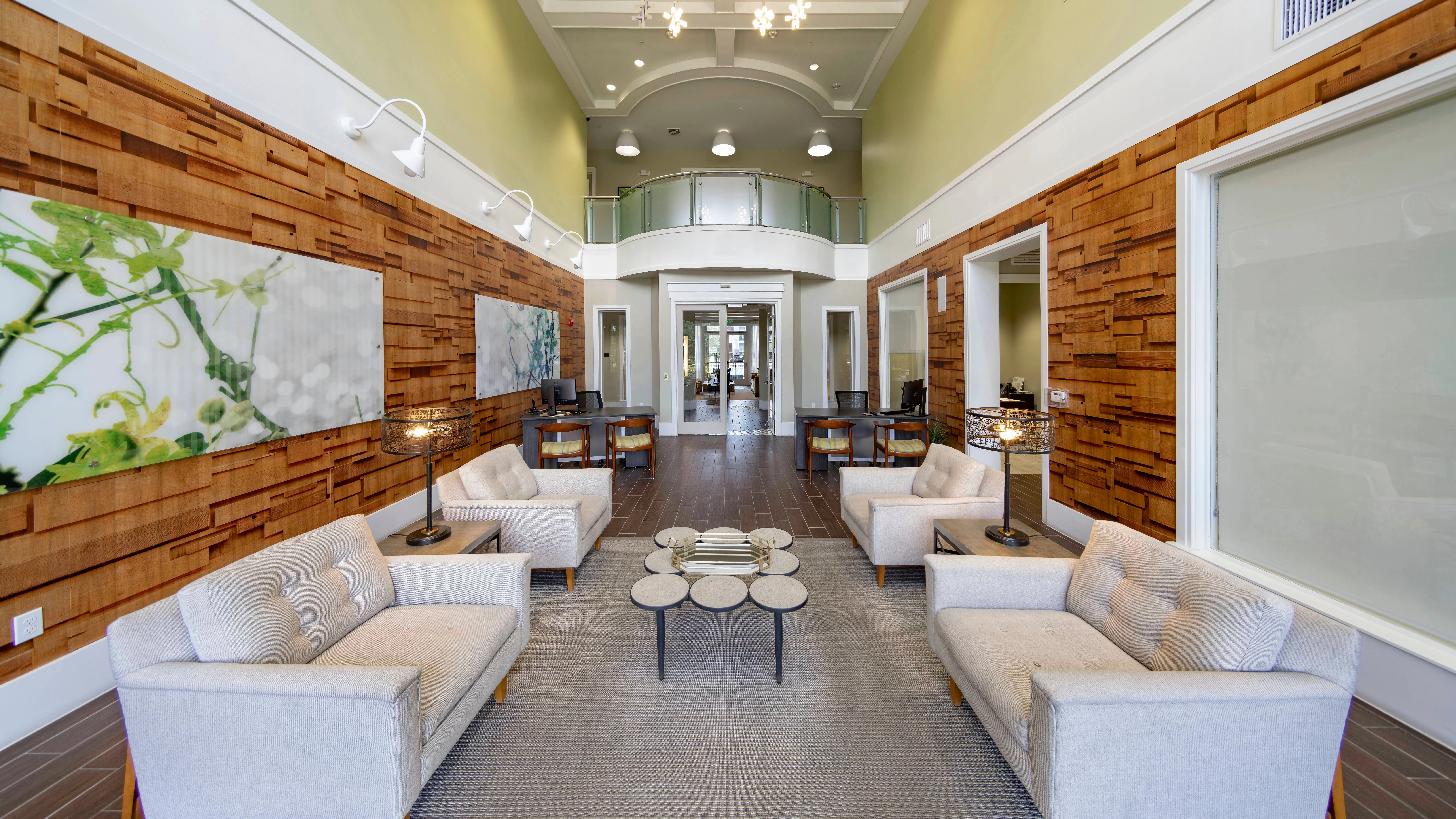 This community features a two-story clubhouse with a tech lounge and coffee bar, sports lounge with billiards, yoga studio, and a conference room with computer workstations.