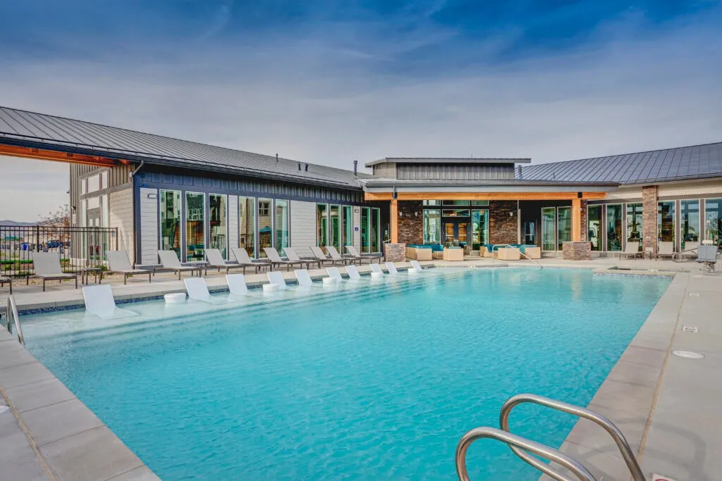 Resort-style amenities include a refreshing swimming pool, spa, spacious pool deck, and two BBQ areas with seating. Additional features include a bark park, pet spa, EV charging stations, a basketball half court, a Tot Lot playground, and a central fire pit. The fitness center, yoga/spin studio, coworking space, and game lounge offer ample opportunities for productivity and play.