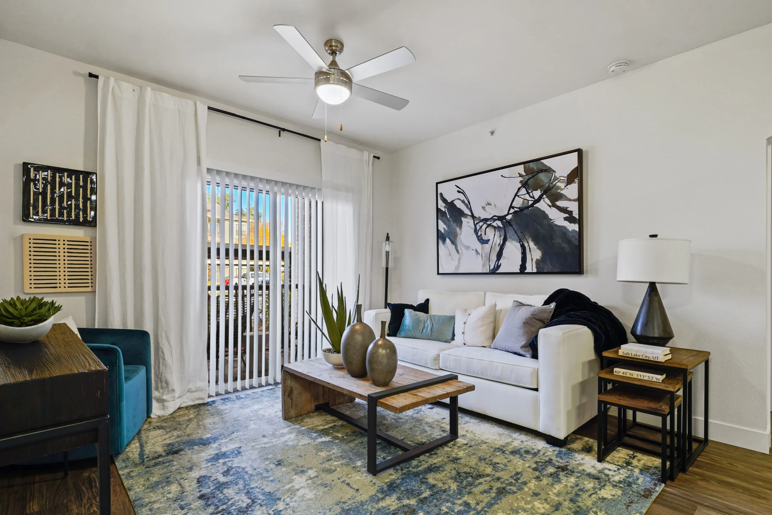 Apartments offer quartz countertops, stainless-steel appliances, tile backsplashes, and wood-style plank flooring. Units include vaulted ceilings, decorative shelving, private patios or balconies with mountain views, and full-size washers and dryers. Garages are available for select homes.