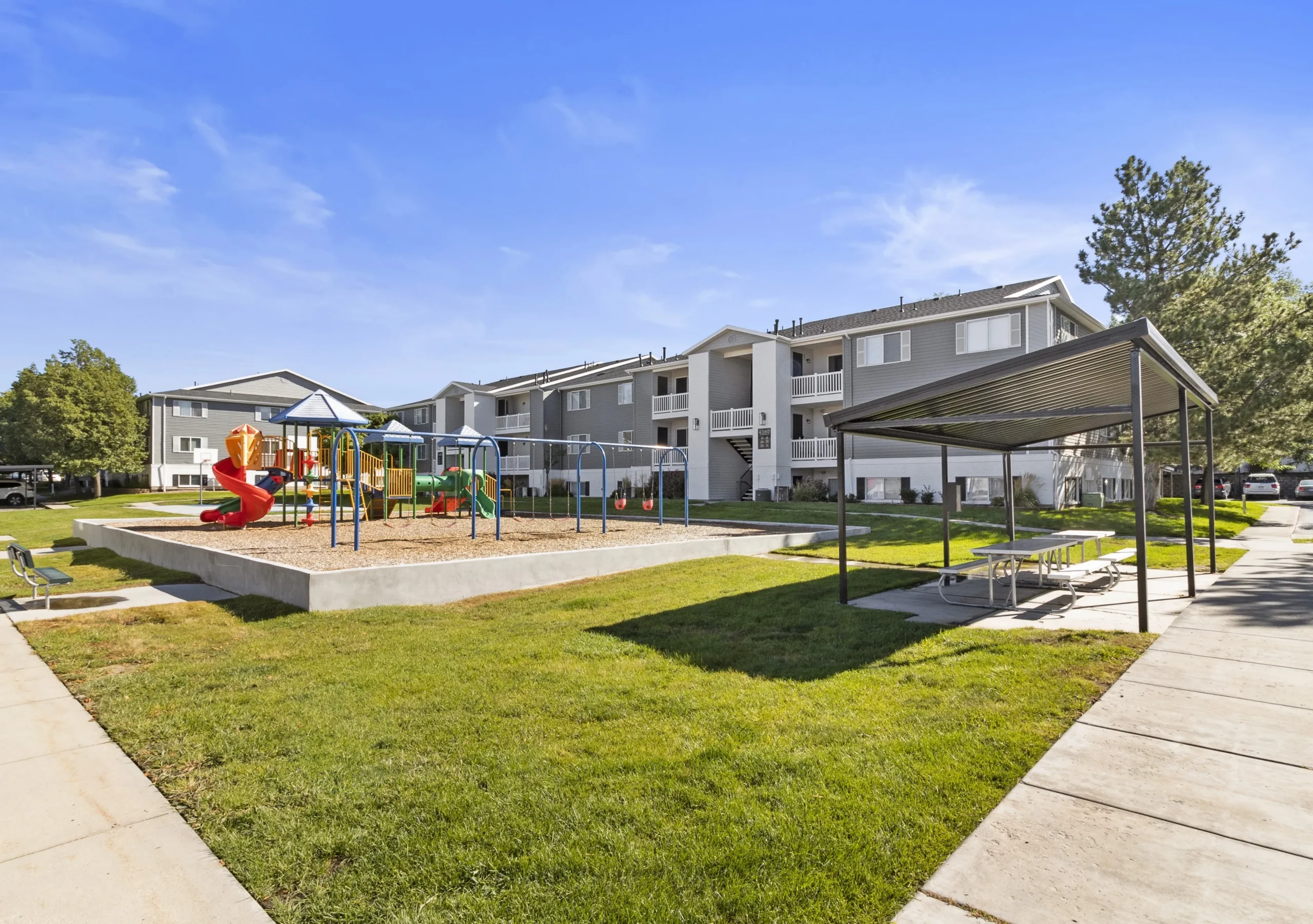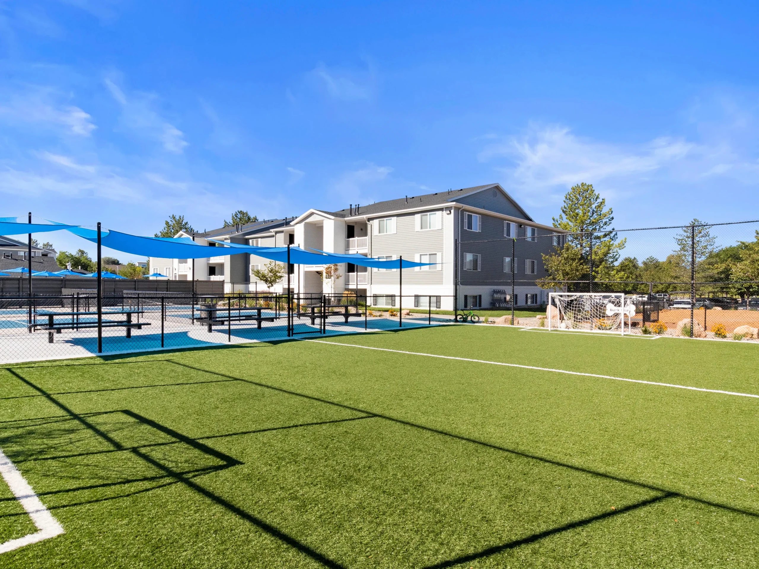 Amenities include a swimming pool, hot tub, fitness center, playground, pickleball court, soccer court, basketball court, picnic area, and pet park. Residents also have valet trash service, package lockers, and covered parking.